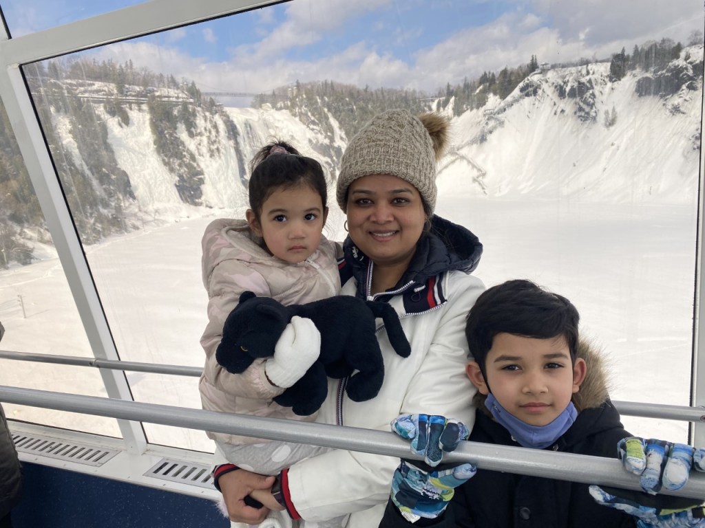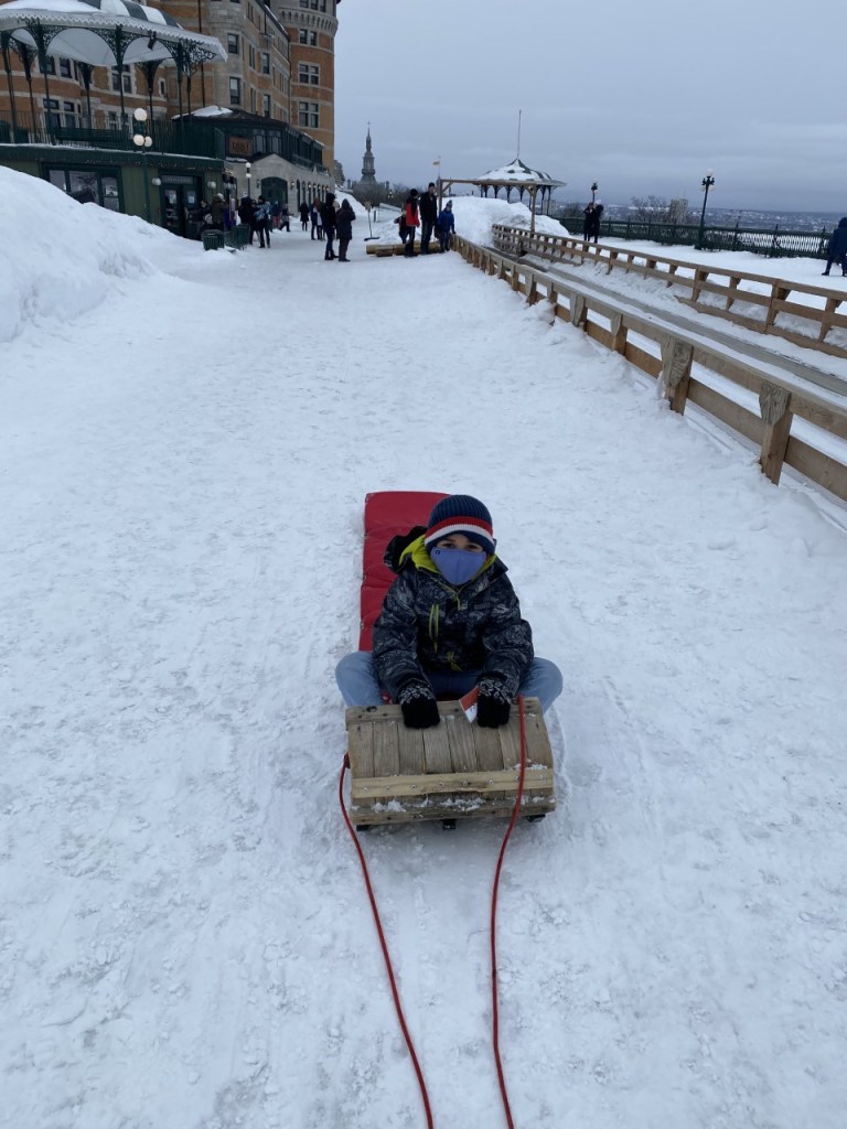 “Yawn… good morning, everyone!” we are finally going to enter Quebec City! We all are very excited. We all got ready in a hurry. After breakfast, we carried all the bags downstairs and checked out of the hotel. Once we got out of the town, and on to the highway, I got back to working on my puzzle book. After about an hour we reached Quebec City, but we did not go to the hotel yet, first we went to a waterfall called Montmorency falls. They had a cable cart stand and a lookout tower there. We all got tickets for the cable carts, so we all got in the cart and a guy pushed a button then the cart started moving. We saw the almost frozen fall…the view was amazing. We also walked around and went on to the bridge hanging above the fall.